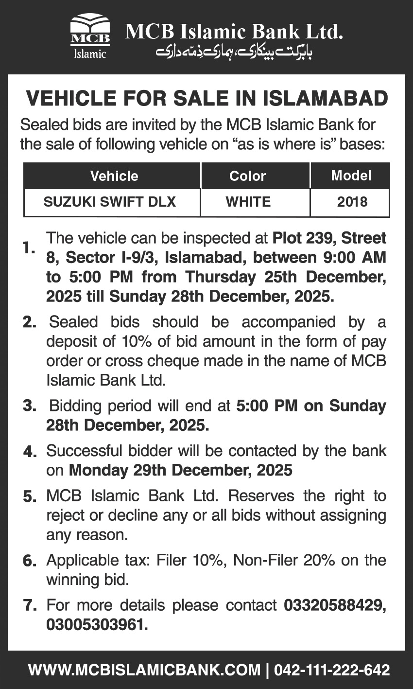 Auction Ad – Vehicle for Sale In Islamabad (December 4, 2024)