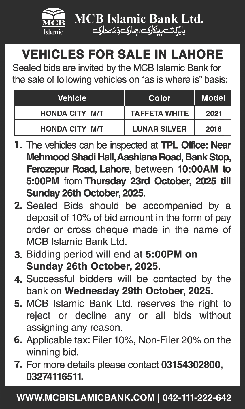 Auction Ad – Vehicle for Sale in Lahore (October 03, 2021)