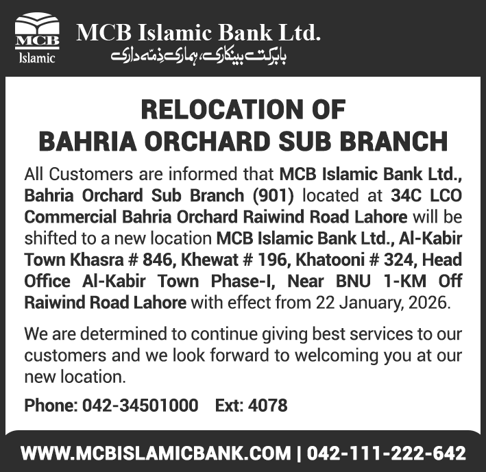 Relocation of MCB Islamic Bank Mirpurkhas Branch
